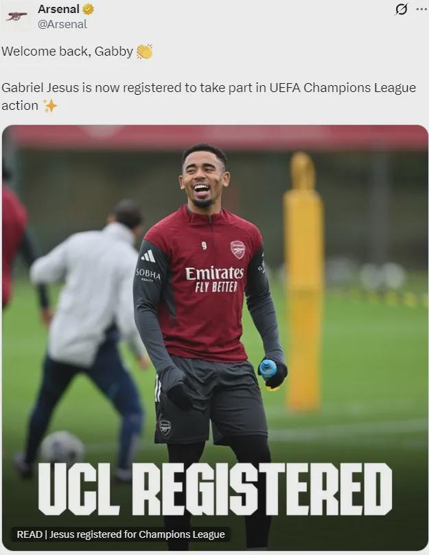 官方:热苏斯取代道曼进入了阿森纳的欧冠A名单,立即生效,鉴于此,热苏斯将可以代表阿森纳出战对布鲁日的欧冠比赛。